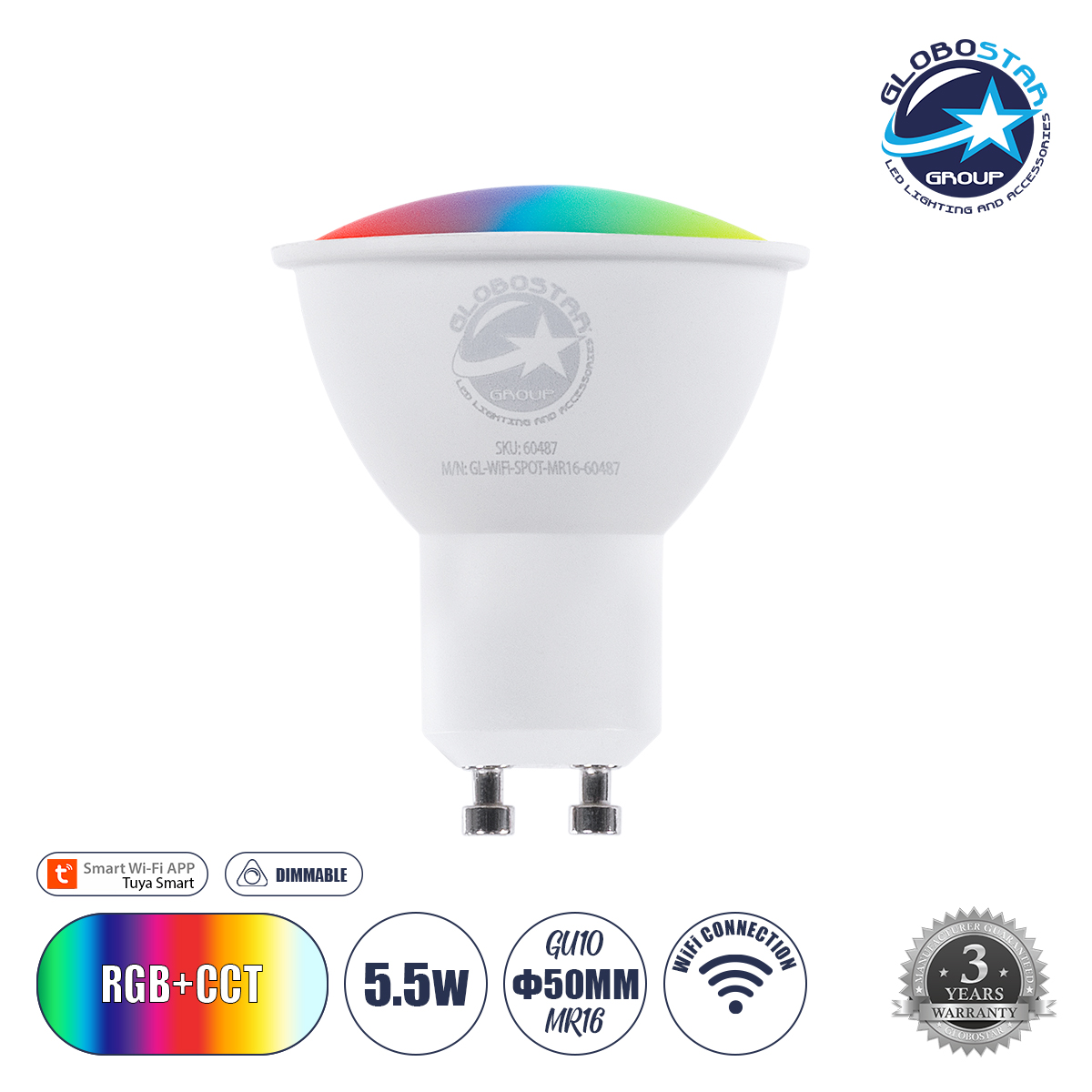 GLOBOSTAR® SMARTME 60487 Σποτ GU10 MR16 Smart Home WiFi με Λειτουργία μέσω Tuya APP LED 5.5W 550lm 120° AC 220-240V IP20 Πολύχρωμο RGBW+WW Dimmable – Bridgelux Chip – Μ5 x Π5 x Υ6.5cm – 3 Χρόνια Εγγύηση