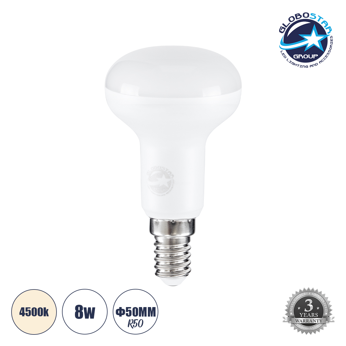 GloboStar® SPOTBULB 60076 Λάμπα E14 R50 LED 8W 776lm 120° AC 220-240V IP20 Φυσικό Λευκό 4500K – Lumileds SMD Chip – Λευκό Γαλακτερό -Μ5 x Π5 x Υ8.9cm – 3 Χρόνια Εγγύηση