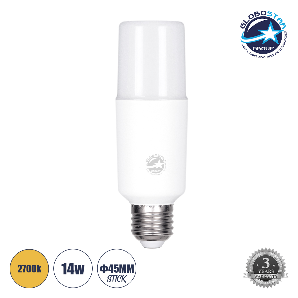GLOBOSTAR® STICK 60059 Λάμπα E27 LED 14W 1540lm 260° AC 220-240V Αδιάβροχο IP54 Θερμό Λευκό 2700K – Lumileds SMD Chip – Λευκό Γαλακτερό – Μ4.5 x Π4.5 x Υ13.7cm – 3 Χρόνια Εγγύηση