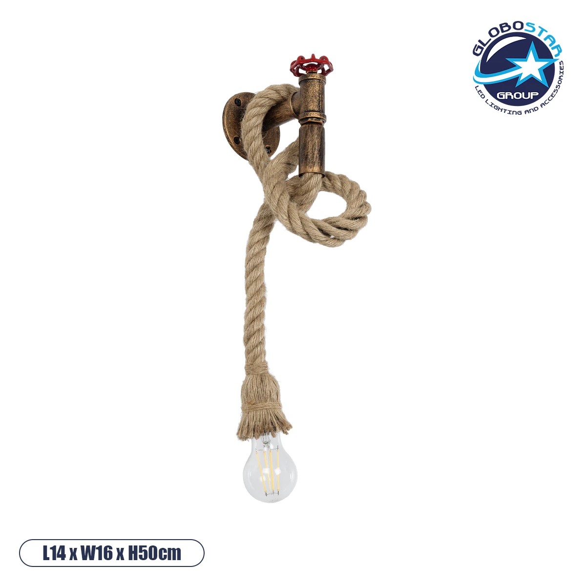 GloboStar® TROUVER 01183 Vintage Industrial Φωτιστικό Τοίχου Απλίκα Μονόφωτο Μπρούτζινο Σκουριά Μεταλλικό με Μπεζ Σχοινί Μ14.5 x Π3.3 x Υ16cm