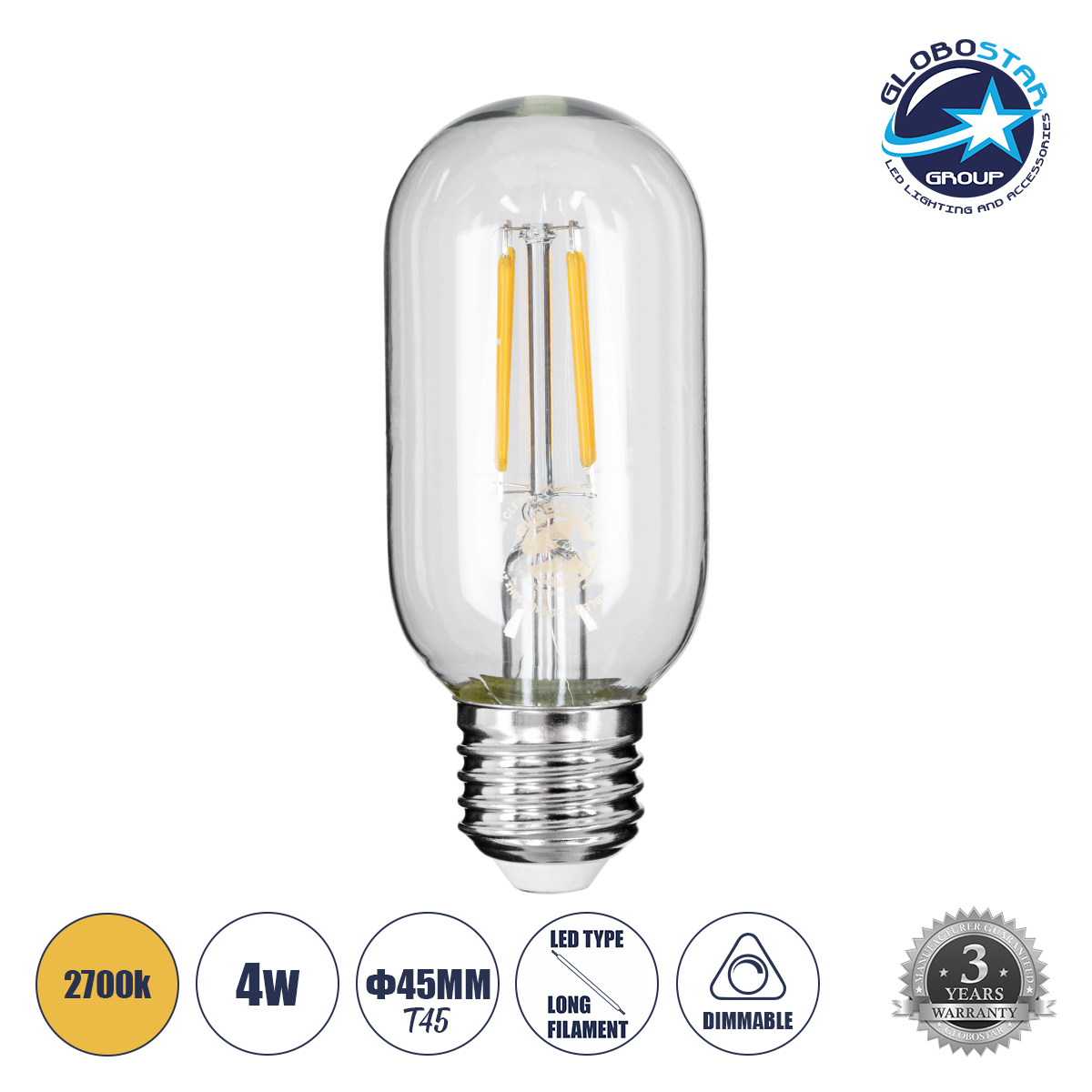 GLOBOSTAR® TUBIS 99018 Λάμπα Σωλήνας E27 T45 LED 4W 400lm 360° AC 220-240V IP20 Θερμό Λευκό 2700K Dimmable – Long Filament Chip – Διάφανο – Μ4.5 x Π4.5 x Υ11cm – 3 Χρόνια Εγγύηση