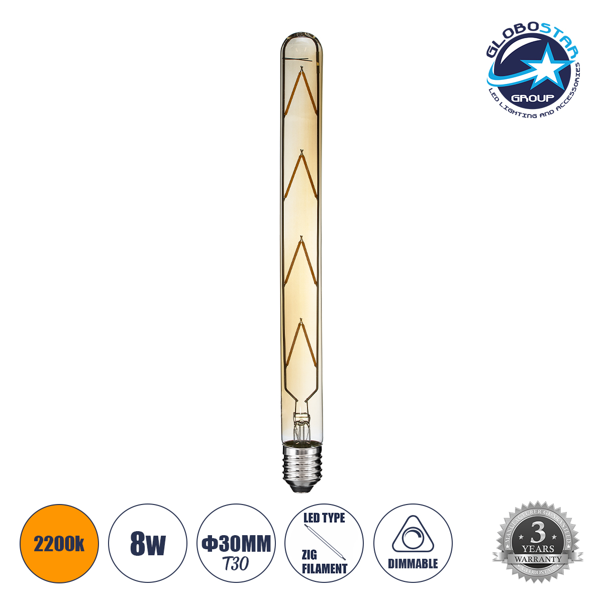 GLOBOSTAR® TUBIS 99050 Λάμπα Σωλήνας E27 T30 LED 8W 720lm 360° AC 220-240V IP20 Ultra Θερμό Λευκό 2200K Dimmable – Long Filament Chip – Μελί – Μ3 x Π3 x Υ30cm – 3 Χρόνια Εγγύηση
