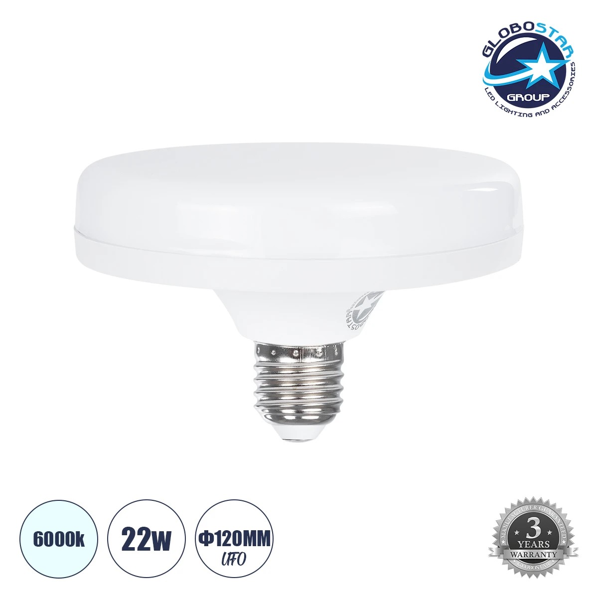 GLOBOSTAR® UFO 60069 Λάμπα E27 F120 LED 22W 2200lm 180° AC 220-240V IP20 Ψυχρό Λευκό 6000K – Lumileds SMD Chip – Λευκό Γαλακτερό – Μ12 x Π12 x Υ7.5cm – 3 Χρόνια Εγγύηση