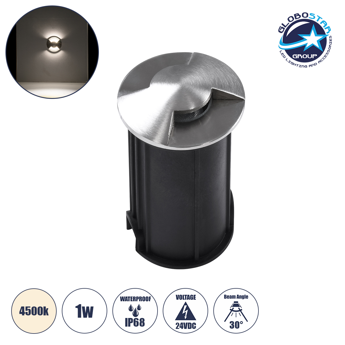 GLOBOSTAR® UNDERGROUNDRENA 90663 Χωνευτό Αρχιτεκτονικο Φωτιστικό Σποτ Δαπέδου LED 1W 115lm 30°+30° DC 24V Αδιάβροχο IP68 Φυσικό Λευκό 4500K Dimmable – Bridgelux SMD Chip – Ανοξείδωτο Ατσάλι SS304 – Μ5 x Π5 x Υ9cm / Q4.2cm – 3 Χρόνια Εγγύηση