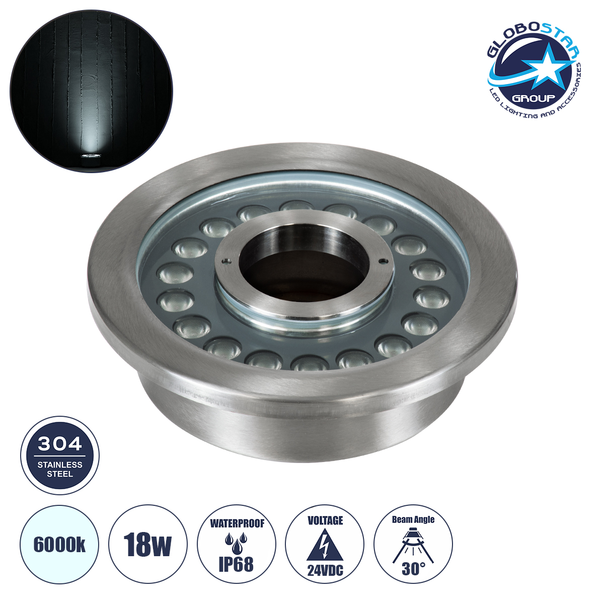 GloboStar® UNDERWATER-DENIS 90442 Υποβρύχιο Χωνευτό Φωτιστικό Σποτ Ειδικό για Σιντριβάνια – Πισίνες – Τζακούζι LED 18W 1800lm 30° DC 24V Αδιάβροχο IP68 Φ21.5 x Υ8cm Ψυχρό Λευκό 6000K – Ανοξείδωτο Ατσάλι SS304 – 3 Years Warranty