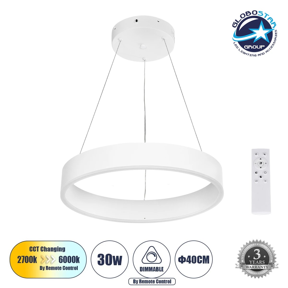 GLOBOSTAR® VENOM 61174 Μοντέρνο Κρεμαστό Φωτιστικό Οροφής LED 30W 3513lm 120° AC 220-240V IP20 Ρυθμιζόμενο Λευκό CCT με Χειριστήριο από 2700K έως 6000K Dimmable – Lumileds SMD Chip – Λευκό Ματ – Μ40 x Π40 x Υ6.5cm – 3 Χρόνια Εγγύηση