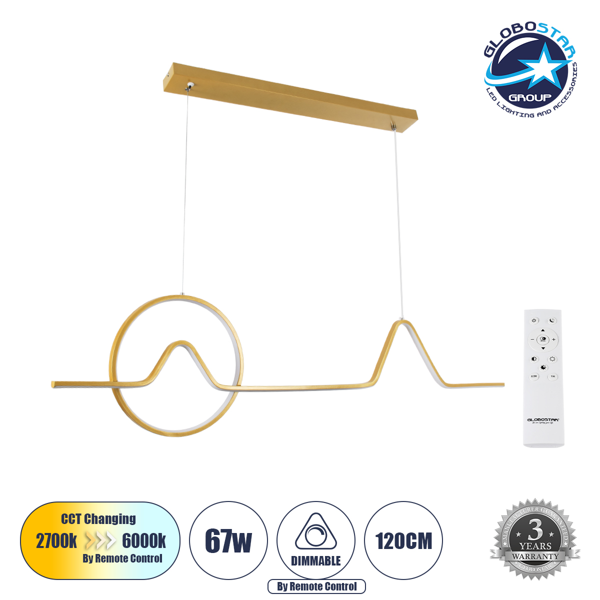 GLOBOSTAR® WINDY 61293 Μοντέρνο Κρεμαστό Φωτιστικό Οροφής LED 67W 7504lm 300° AC 220-240V IP20 Ρυθμιζόμενο Λευκό CCT με Χειριστήριο από 2700K έως 6000K Dimmable – Lumileds SMD Chip – Χρυσό Βούρτσας – Μ120 x Π4 x Υ30cm – 3 Χρόνια Εγγύηση