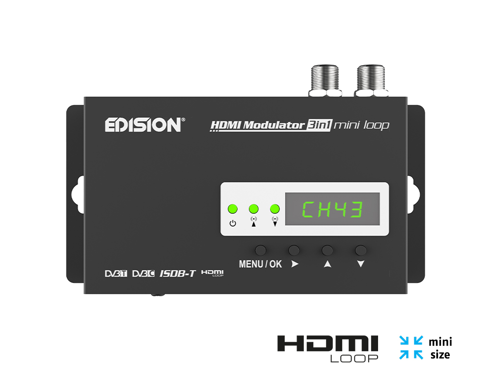 Ψηφιακός μονοκάναλος HDMI διαμορφωτής με δυνατότητα απεικόνισης της πηγής HDMI στην κύρια τηλεόραση (HDMI-loop), επίσης διαθέτει RF-ΙΝ ΕΙΣΟΔΟ μίξης. Με είσοδο σήματος από οποιαδήποτε πηγή HDMI (Δορυφορικό δέκτη, TV Box, CCTV, DVD, Digital Signage κ.ά.), διαμόρφωση και έξοδο σε Επίγειο Ψηφιακό DVB-T, ISDB-T ή Καλωδιακό DVB-C MPEG4 FULL HD σήμα. Παρέχει εξαιρετική ποιότητα σήματος στην έξοδο του, σε συνδυασμό με την γρήγορη ρύθμιση με την λειτουργία ID Pre-Config και εξοικονόμηση χώρου στην εγκατάσταση με εξαιρετικά compact διαστάσεις για ευκολία τοποθέτησης, ακόμα και όπου υπάρχει ελάχιστος χώρος.