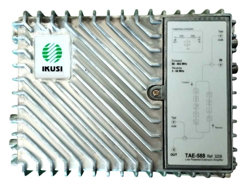 AE-588Τρόπος τροφοδοσίας: Μέσω γραμμής από την είσοδο RF ή από τη θύρα εξόδου RF – είσοδος ↔ έξοδος 1 με διέλευση ισχύοςΕύρος ζώνης:Προωθητική διαδρομή: MHz 86-862Αντίστροφη διαδρομή: MHz 5-66Προωθητική διαδρομήΟμαλότητα απόκρισης: dB ± 0.75Ονομαστική ενίσχυση: dB 35Μεταβλητός εξασθενητής εισόδου: dB 0-18Περιοχή ρύθμισης κλίσης: dB 0-18Συντελεστής θορύβου: dB ≤ 7.5Επίπεδο εξόδου (IM3 -60dB, DIN 45004B): dBμV 124Επίπεδο εξόδου (IM2 -60dB, EN 50083-3): dBμV 115Επίπεδο εξόδου (CTB -60dB, EN 42 ch): dBμV 110Επίπεδο εξόδου (CSO -60dB, EN 42 ch): dBμV 114Δοκιμαστική έξοδος: dB -30Αντίστροφη διαδρομήΕνίσχυση: dB 25.5Μεταβλητός εξασθενητής εισόδου: dB 0-18Συντελεστής θορύβου: dB ≤ 6.5Επίπεδο εξόδου (-60dB, DIN 45004B): dBμV 115Επίπεδο εξόδου (IM2 -60dB, EN 50083-3): dBμV 108Δοκιμαστική έξοδος: dB -30ΓενικάΤάση τροφοδοσίας λειτουργίας: Vac 24-90Κατανάλωση: mA 19Διαστάσεις: mm 220 x 150 x 55Μέγιστο ρεύμα διέλευσης AC: 1A