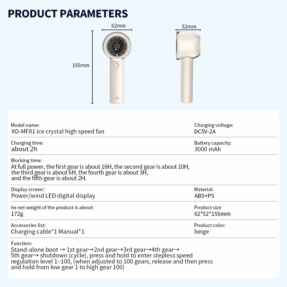 ■Χρόνος φόρτισης: περίπου 2 ώρες■Χωρητικότητα μπαταρίας: 3000 mAh■Χρόνος εργασίας: πλήρως φορτισμένο, περίπου 16H στην 1η ταχύτητα, 10H στη 2η ταχύτητα, 6H στην 3η ταχύτητα, 3H στην 4η, 2H στην 5η ταχύτητα.■Οθόνη: ισχύς, ένδειξη ισχύος ανέμου■Υλικό: ABS+PS■Καθαρό βάρος προϊόντος περίπου: 172g■Μέγεθος προϊόντος:: 62*52*155cm■Χρώμα προϊόντος: μπεζ■Λίστα αξεσουάρ: καλώδιο φόρτισης * 1 οδηγίες * 1■Λειτουργίες: αυτόνομη τροφοδοσία → 1 ταχύτητα → 2 σχέσεις → 3 σχέσεις → 4 σχέσεις → 5 σχέσεις → διακοπή λειτουργίας (κύκλος), πατήστε παρατεταμένα για να εισέλθετε στα επίπεδα απείρως μεταβλητής ταχύτητας 1 ~ 100, (όταν ρυθμίζεται στις 100 ταχύτητες και στη συνέχεια πιέζετε 1 ταχύτητα σε υψηλή ταχύτητα 100)