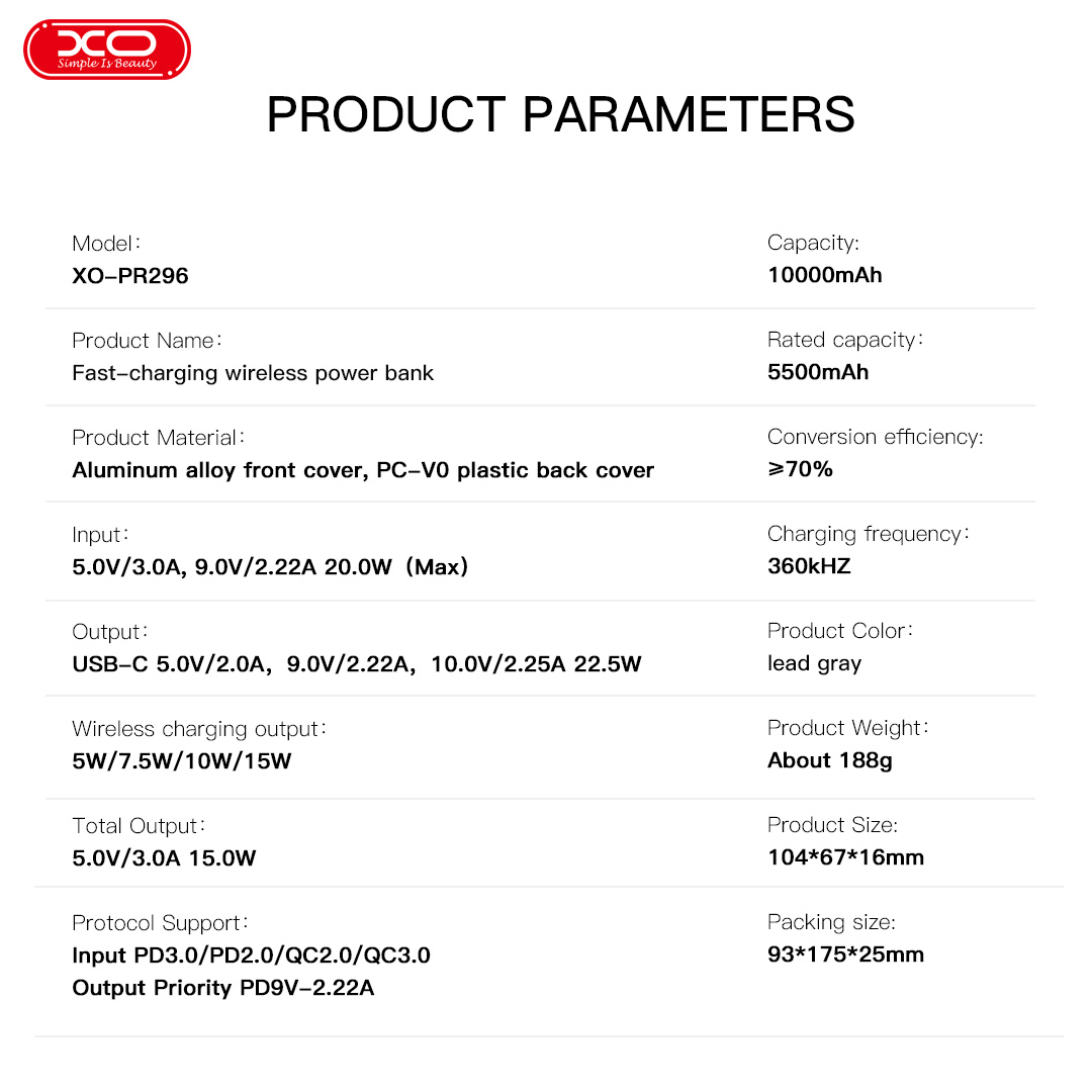 Λεπτομέρειες ΠροϊόντοςΕίσοδος: 5.0V/3.0A, 9.0V/2.22A έως 20.0W (Μέγιστο)Χωρητικότητα μπαταρίας: 10.000mAhΟνομαστική χωρητικότητα: 5.500mAhΈξοδος:USB-C: 5.0V/2.0A, 9.0V/2.22A, 10.0V/2.25A έως 22.5W (Μέγιστο)Ασύρματη φόρτιση: 5W / 7.5W / 10W / 15WΣυνολική έξοδος: 5.0V/3.0A έως 15W (Μέγιστο)Απόσταση φόρτισης: 3–5mmΥλικό προϊόντος: Πάνω κάλυμμα από κράμα αλουμινίου + βάση από PCΔιαστάσεις προϊόντος: περίπου 104 × 67 × 16 mmΒάρος προϊόντος: περίπου 188gΥποστήριξη Πρωτοκόλλων:Είσοδος: PD3.0 / PD2.0 / QC2.0 / QC3.0Έξοδος: Προτεραιότητα PD 9V–2.22A (τα κινητά Huawei δεν εμφανίζουν ένδειξη SuperCharge κατά τη φόρτιση)Ασύρματη φόρτιση: Συμβατή με πρωτόκολλο Qi 5W, Samsung 10W, Apple 7.5W (ξεκλείδωτο Apple έως 15W), μέγιστη ισχύς 15W