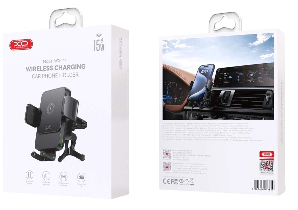 Μοντέλο: XO-WX41Μητρική Πλακέτα: ΗμιαγωγόςΘύρα Εισόδου: Type-CΤάση/Ρεύμα Εισόδου: 5V/2A, 9V/2A, 12V/2A (QC3.0 PD)Πρωτόκολλο Εισόδου: QC3.0 / PD (άνω των 18W)Ισχύς Εξόδου: 5W / 6.5W / 10W / 15W (Μέγιστη)Συμβατό Μέγεθος Κινητού: 4.7–6.7 ίντσεςΣυχνότητα Φόρτισης: 110–205 kHzΑπόσταση Φόρτισης: ≤6mm (προτεινόμενη απόσταση λειτουργίας: 3mm)Λειτουργίες Προστασίας: Προστασία υπερθέρμανσης, υπέρτασης, υπερέντασης, βραχυκυκλώματος, έξυπνη αναγνώρισηΑνίχνευση Μεταλλικών Αντικειμένων: Με ειδοποίηση φόρτισης (LED πράσινη ένδειξη)Υλικό: PC + ABSΔιαστάσεις: 64 x 98 x 17.6mmΒάρος: περίπου 118gΧρώμα Προϊόντος: Μαύρο Γκρι & ΔιαφανέςΜηχανισμός Βραχίονα Σύσφιξης: Πατήστε το κουμπί για να ανοίξει ο βραχίονας, πιέστε τις πλευρές για σύσφιξη με ελατήριο γραναζιού.